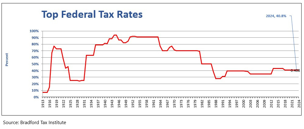 The 2017 Tax Cut & Jobs Act (TCJA) was a contested bill signed into law that permanently set US corporate taxes to a 21% limit while only temporarily reducing personal income taxes under the budget reconciliation rule. While it may not feel like it, Federal taxes are below historical norms. Like warm blankets on a cold morning, its easy to get used to them and God help whoever tries to take them away.