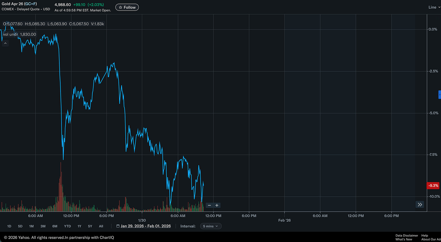 The commotion also bled into the NASDAQ and SPY; however, both indexes began their current pullbacks on the 28th and 27th of January, respectively. This implies that the January 30th announcement of Kevin Warsh as Fed Chair appointee isn’t the only thing weighing on stocks. More on that in a later installment.