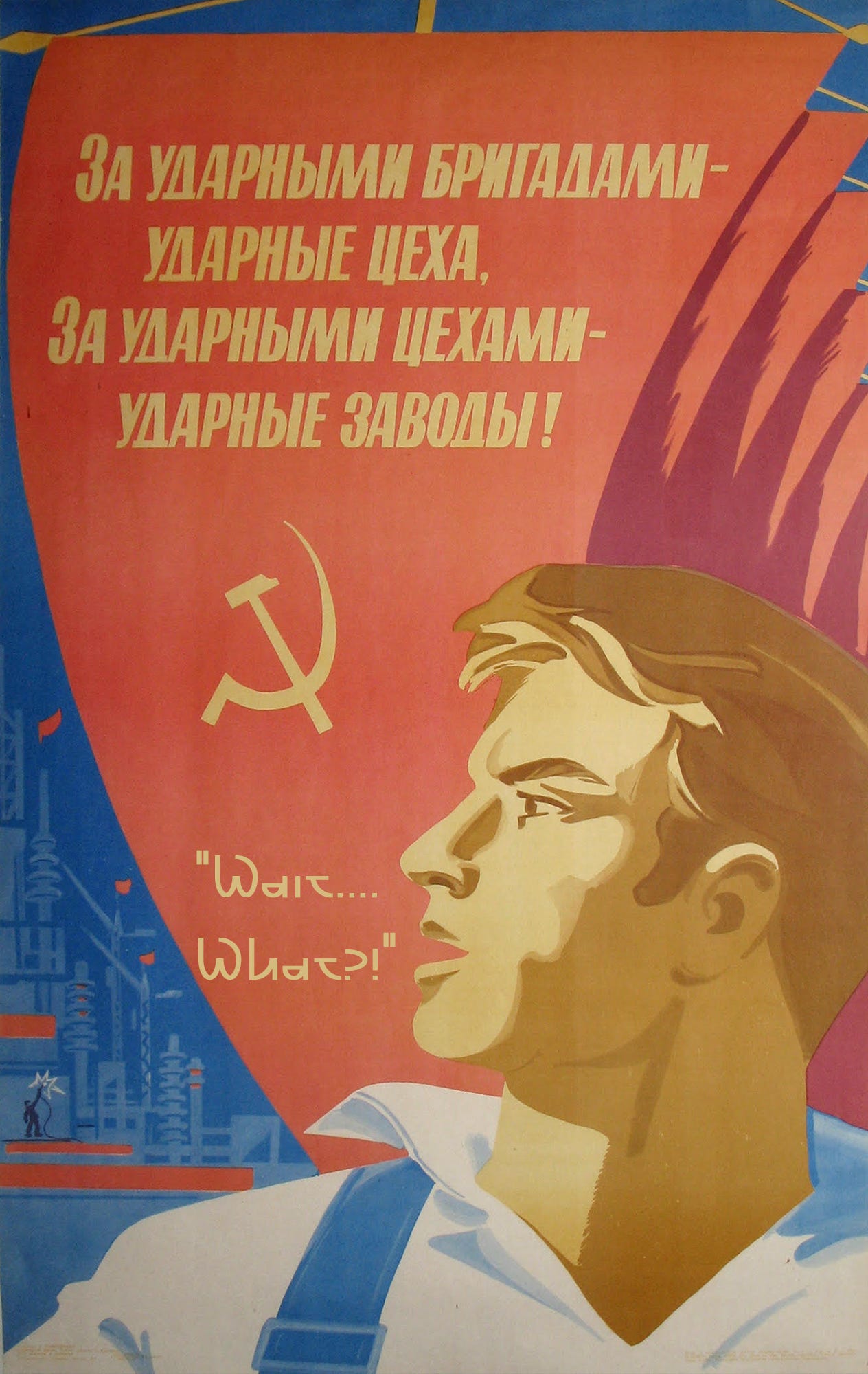 Actual Soviet propaganda poster reads, “Behind the shock brigades — shock workshops, Behind the shock workshops — shock factories!”. English text added for comic effect.