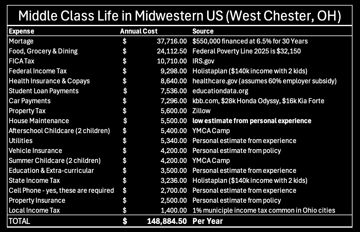 To live a middle-class life in an average Midwestern US city, it takes around $150,000 per year. To make things even more real, the tax estimates above assume household incomes of $140,000 per year which means this household is in a spending deficit.