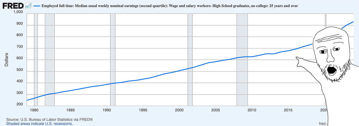 The high-school graduate wage has increased 2.97% per year since 1979. If true, how is it that my grandfather was able to sustain a household of six working for $10 per hour ($38/hour today, adjusted for inflation) at a steel mill, retire with comfort and die a millionaire?