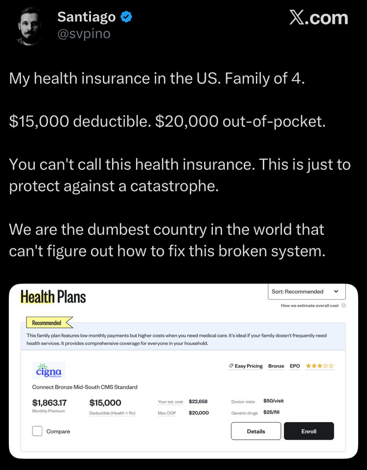 Healthcare costs: As I wrote two weeks ago, the average healthcare premium for a family of four is $26,993 per year. This is up nearly 6,851%, which might as well be infinity percent, from the $394 per year insurance premiums in 19802. Time-constrained workers with never-off-the-clock jobs struggle to maintain health, which only exacerbates the cost issue.